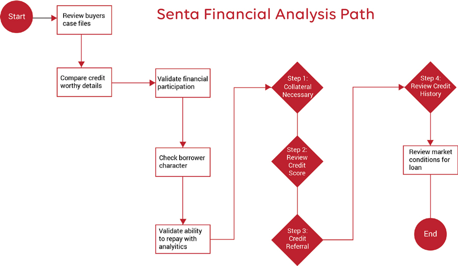 The financial review process Senta used is linear because an analyst is required to verify data credibility before a loan can be issued. As the future continues to evolve, the best practice evaluation may utilize alternative methods.