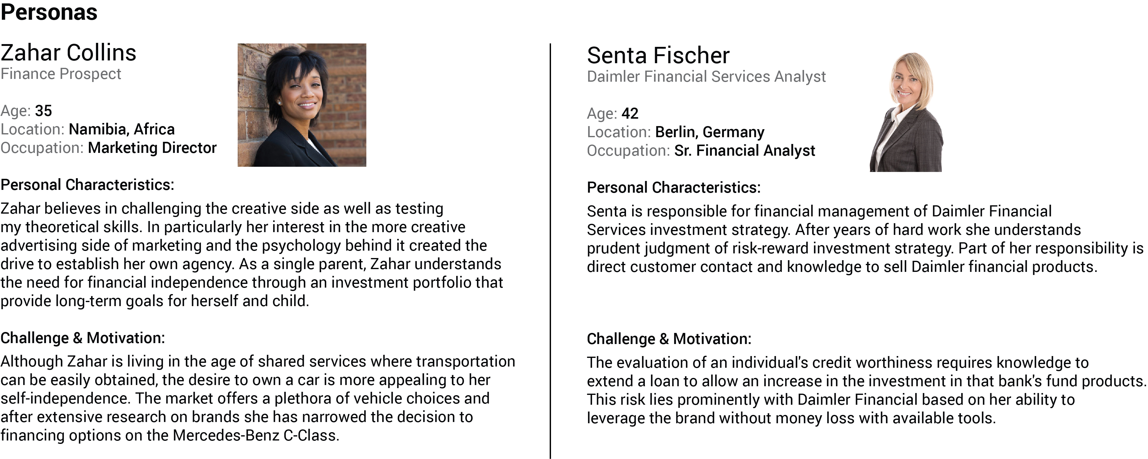 The personas developed for this conceptual design were based on a typical customer seeking a creative financing for a vehicle purchase and the financial service analyst.