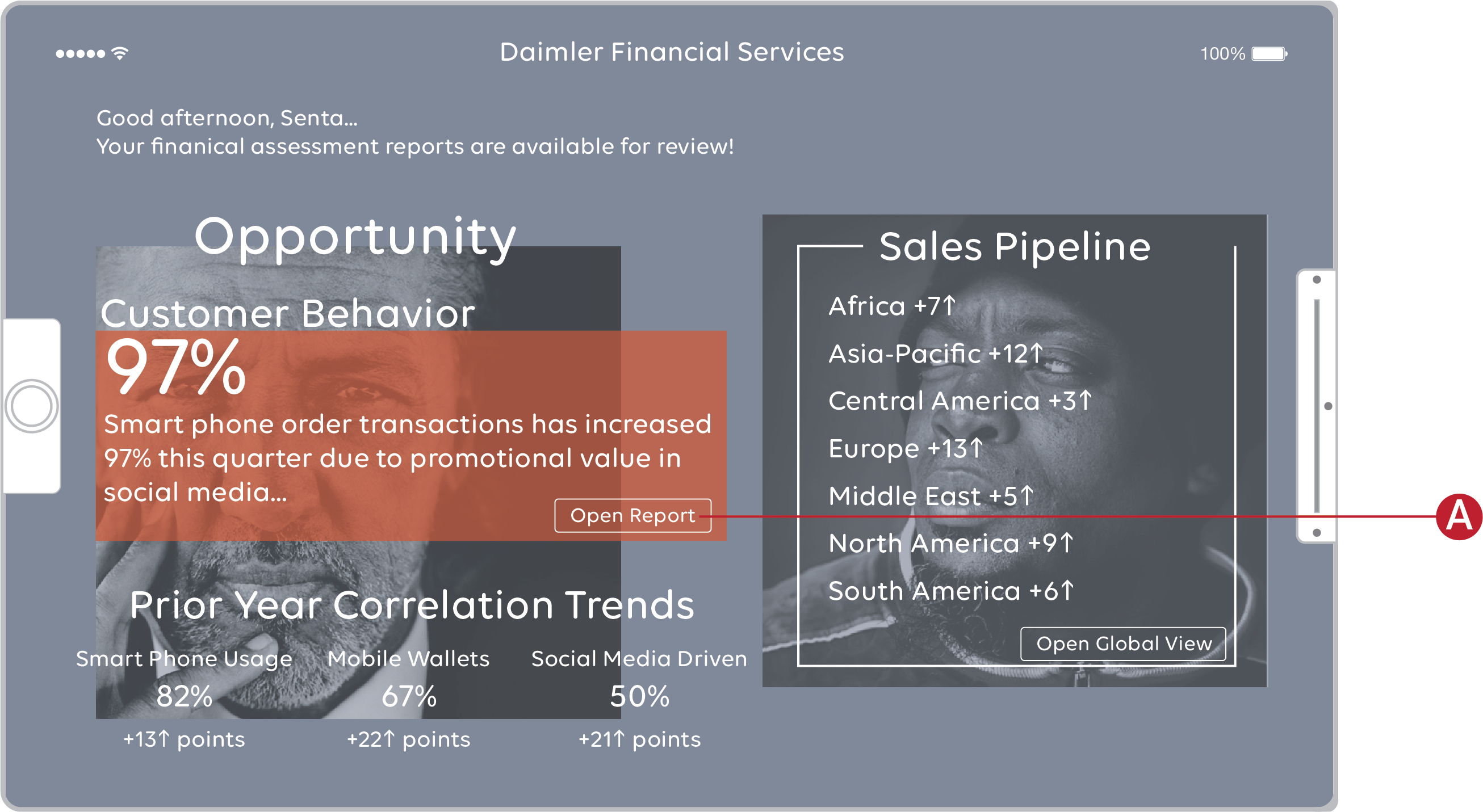 At this stage of credit evaluation, Senta can review transaction behavior across a wide variety of metrics. Each page division provides the capability to drill-down for additional datapoints. In this wireframe the Open Report button advances the view to the following content.