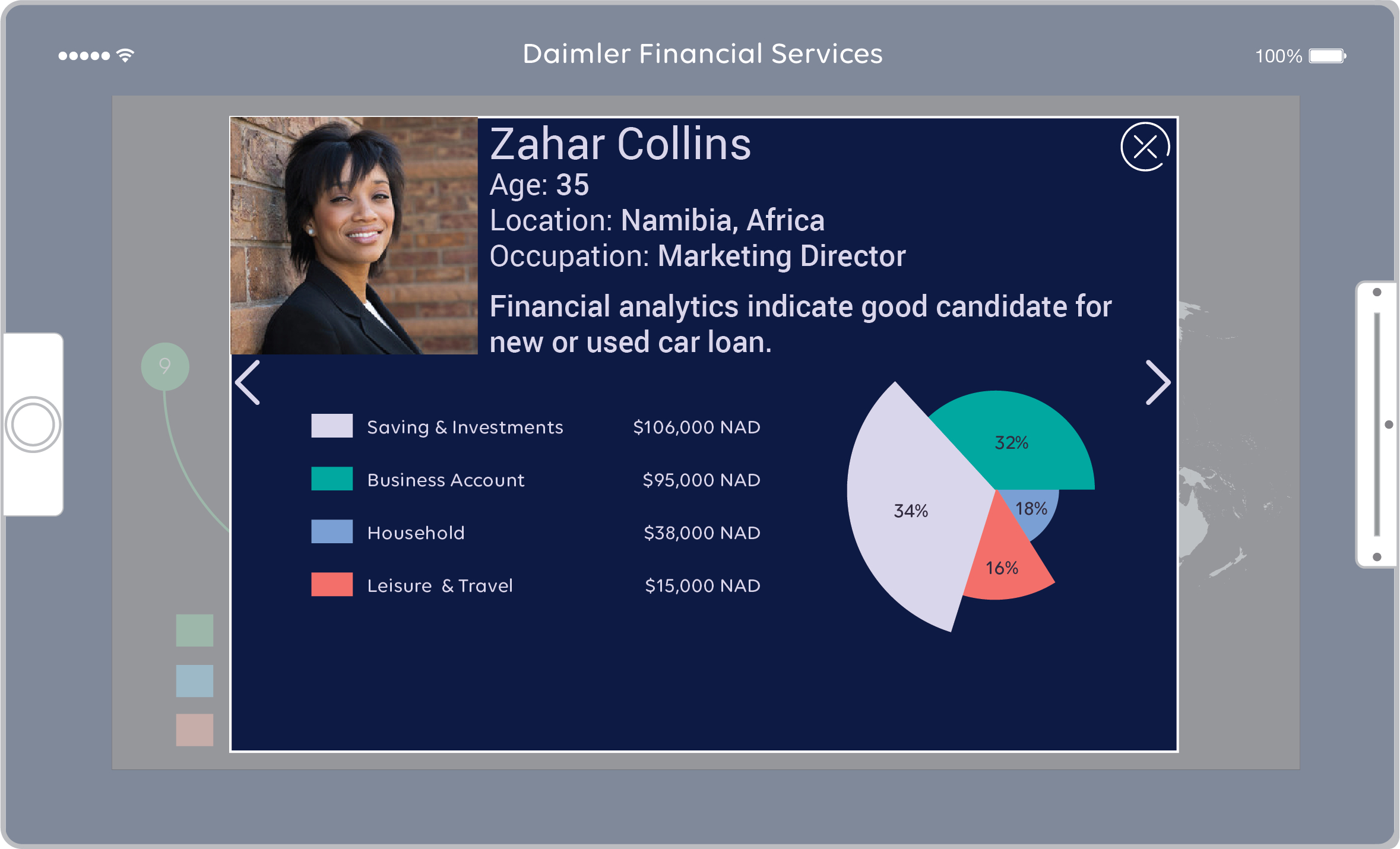 At this stage of Zahra’s decision making, personal authentication into her available financial resources. This digital wealth management view provides insight into cloud financial data records shared across multiple financial institutions. Once complete, Zahra can share this information with the financial analysts of her choice.